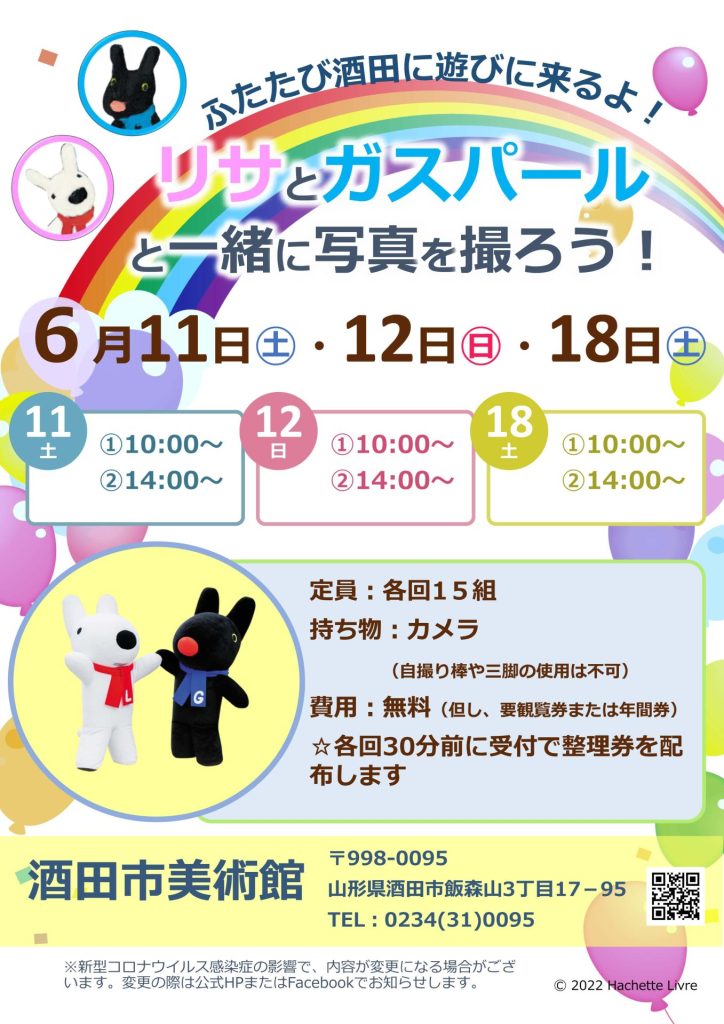 リサとガスパールと一緒に写真を撮ろう! 日時:6月11日㊏、12日㊐、18日㊏ 各回10時~、14時~ 定員:各回先着15組 持ち物:カメラ(自撮り棒や三脚の使用は不可) 費用:無料(但し、要観覧券又は年間券) チラシ(PDF)ダウンロード